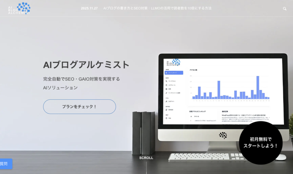主力サービスとして、 WordPressに連携し、ブログ記事を毎日自動的にアップ投稿する「AIブログアルケミスト」という生成AIプロダクトを提供しています。